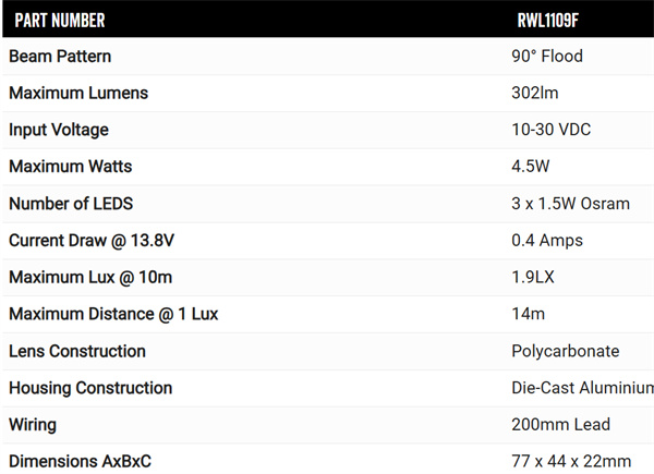 ROADVISION’s RWL1109F Series work / rock lamps offer uncompromised performance and energy efficiency in a compact, easy to install package. This compact work lamp is perfect for any applications where space is limited. Water and dust proof to IP67, the RWL1109F Series feature a super durable light weight die-cast housing and polycarbonate lens, allowing for worry free operation in even the toughest conditions.
